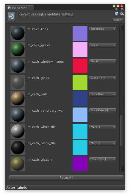 Double-click the field showing ReverbBakingDemoMaterialMap. An asset is selected and the material mappings are shown in the Inspector window.