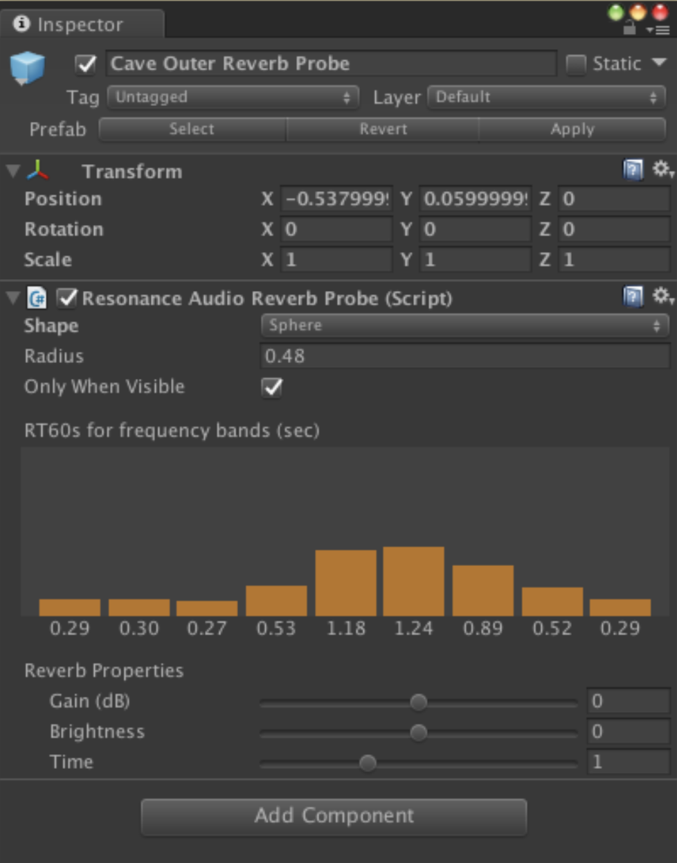 Take a look at one of the selected Reverb Probes. In the Inspector window, there should be some RT60s for different frequency bands (low-frequency to high-frequency bands appear left to right).